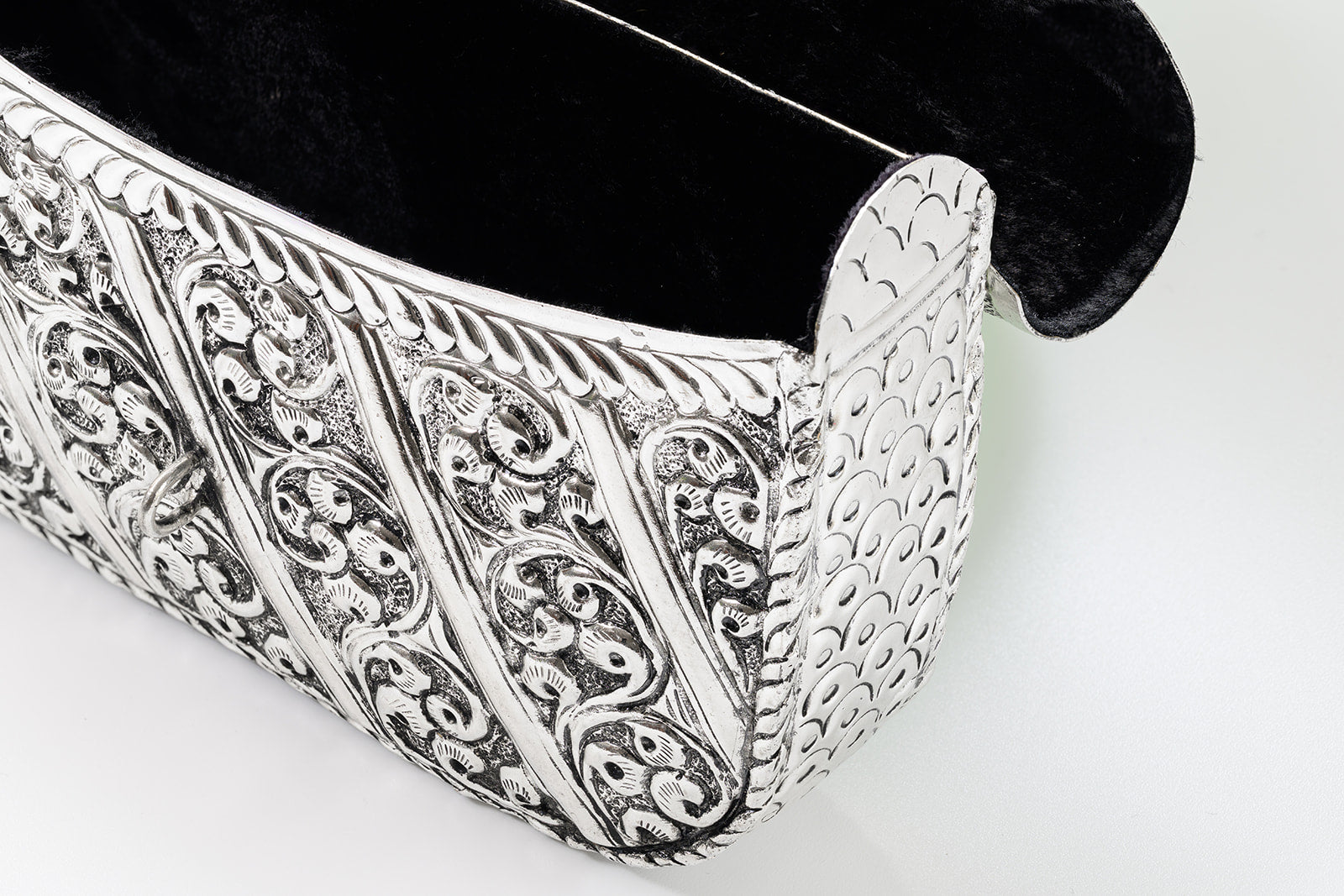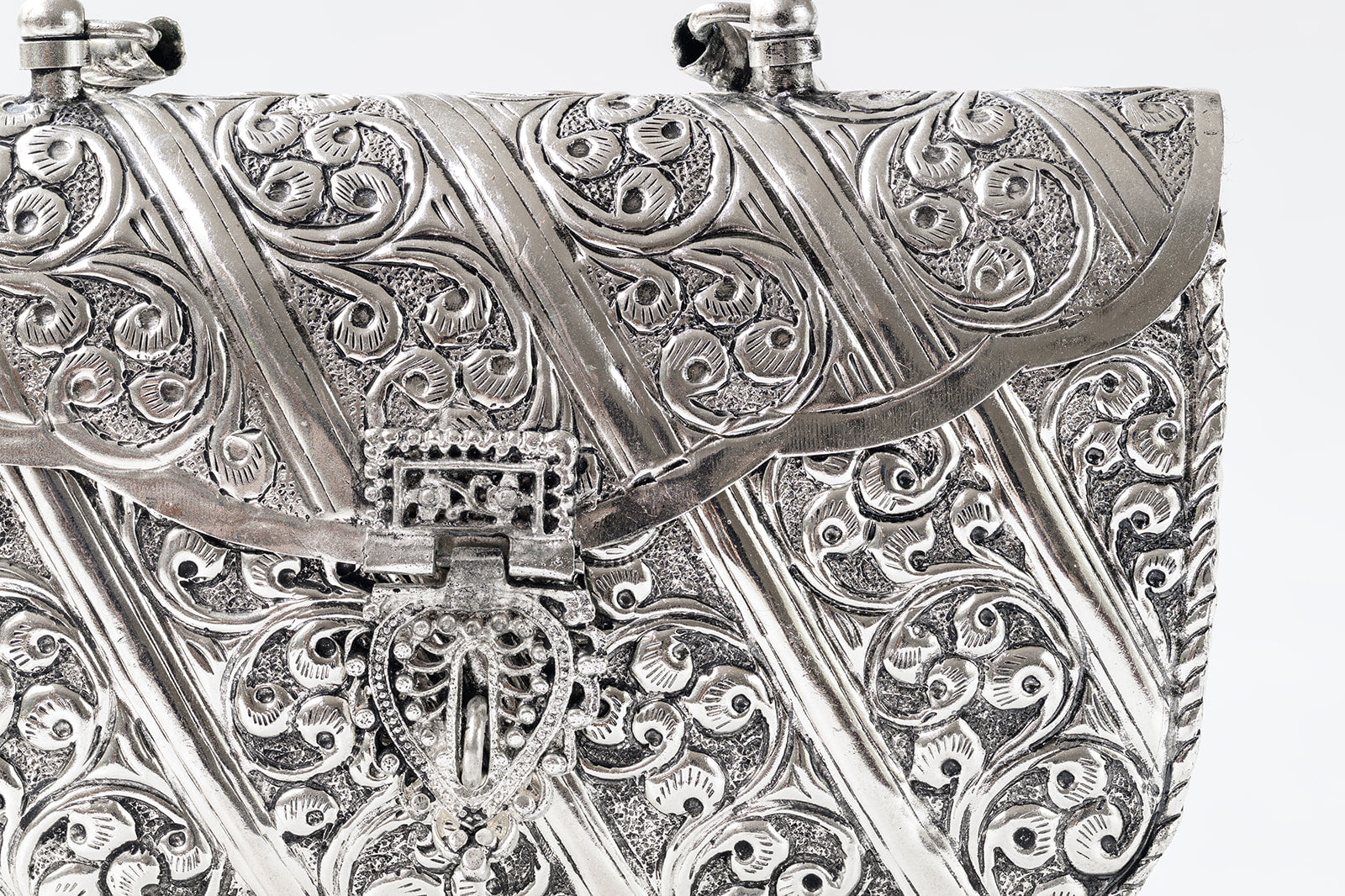 - Each bag is hand-engraved by master metalworkers inspired by regal traditions, preserving techniques passed down through generations.